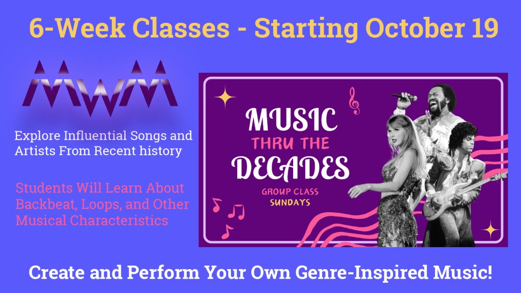 Our NEW Music Thru the Decades class explores some of the most influential songs and artists from recent history, and how it influences popular music today. Students will learn about backbeat, loops, and other musical characteristics, culminating in an opportunity to create and perform their own genre-inspired music!